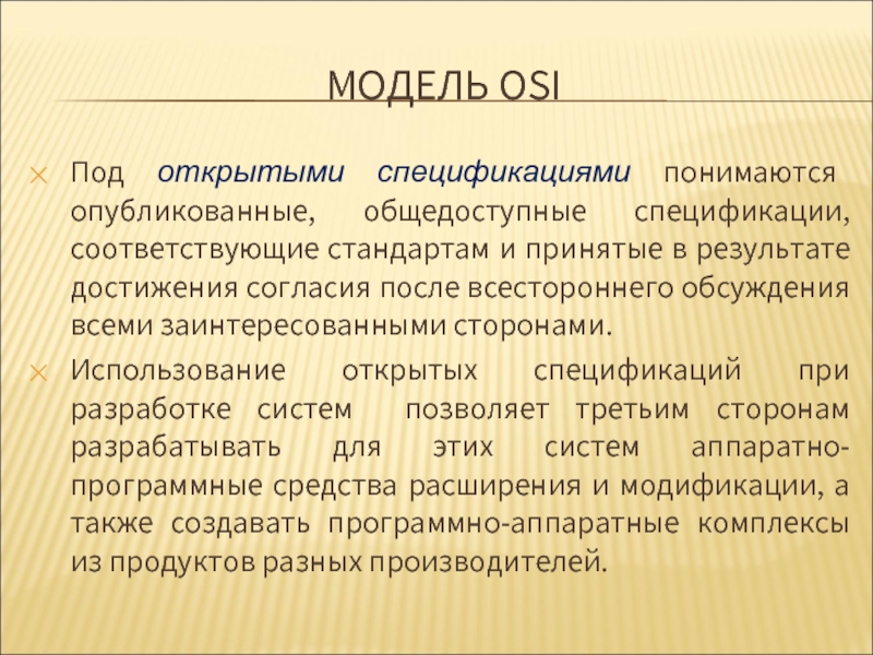 Под открытыми спецификациями понимаются опубликованные, общедоступные спецификации, соответствующие стандартам и