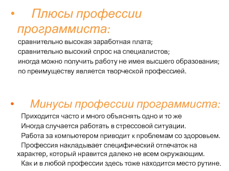 Эта профессия пользуется все большей популярностью у молодежи. Юноши с удовольствием познают науку обращения с современной техникой, ее эксплуатации и создания программ. И вот уже не первое поколение программистов, выпущенных вузами, трудится в многочисленных компаниях и на предприятиях.