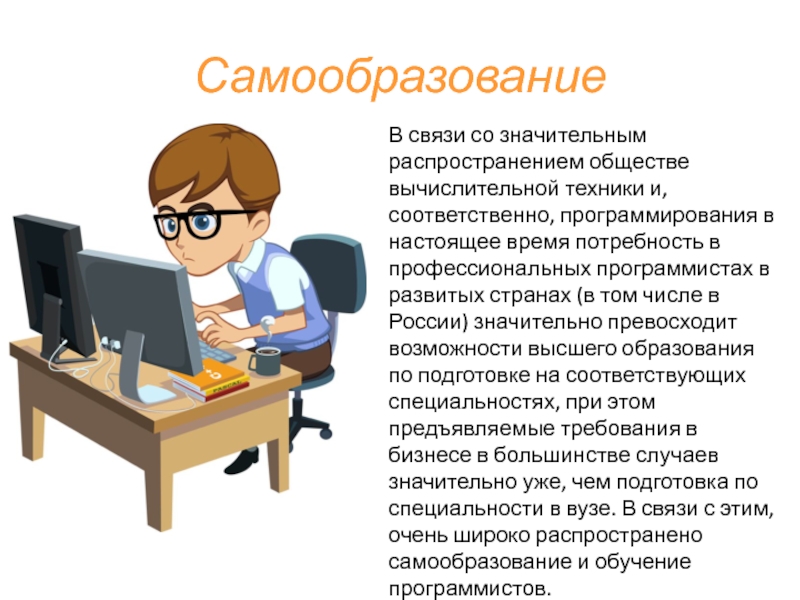 в настоящее время потребность в профессиональных программистах в развитых странах (в том числе в России) значительно превосходит возможности высшего образования по подготовке на соответствующих специальностях, при этом предъявляемые требования в бизнесе в большинстве случаев значительно уже, чем подготовка по специальности в вузе. В связи с этим, очень широко распространено самообразование и обучение программистов.