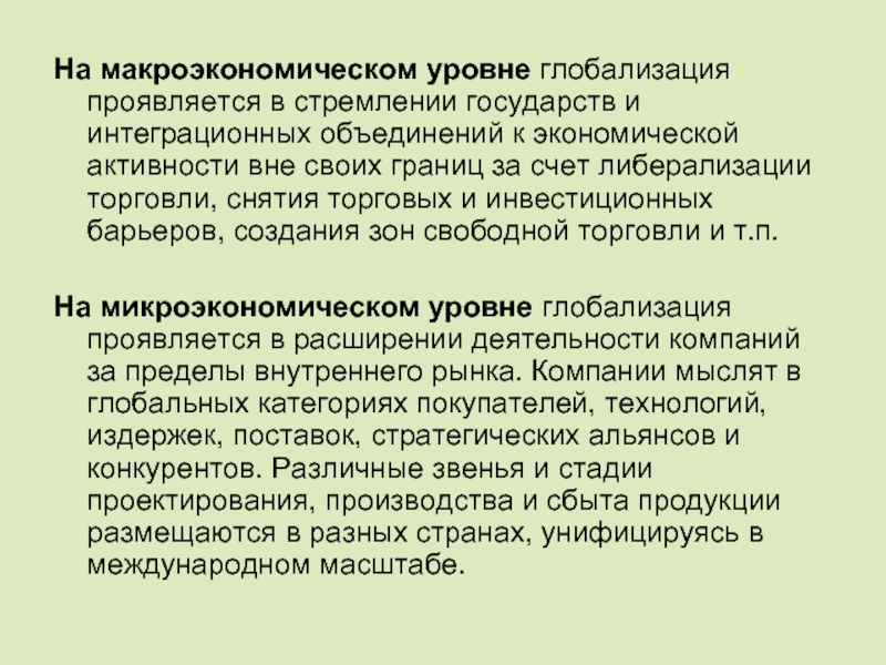 На микроэкономическом уровне глобализация проявляется в расширении деятельности компаний за пределы внутреннего рынка. Компании мыслят в глобальных категориях покупателей, технологий, издержек, поставок, стратегических альянсов и конкурентов. Различные звенья и стадии проектирования, производства и сбыта продукции размещаются в разных странах, унифицируясь в международном масштабе.
