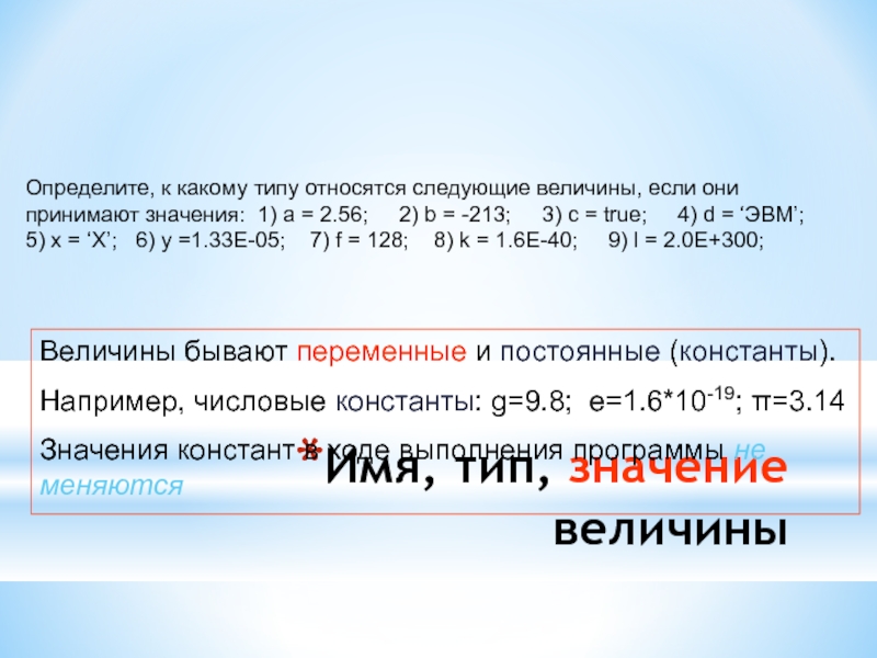 Например, числовые константы: g=9.8; e=1.6*10-19; π=3.14