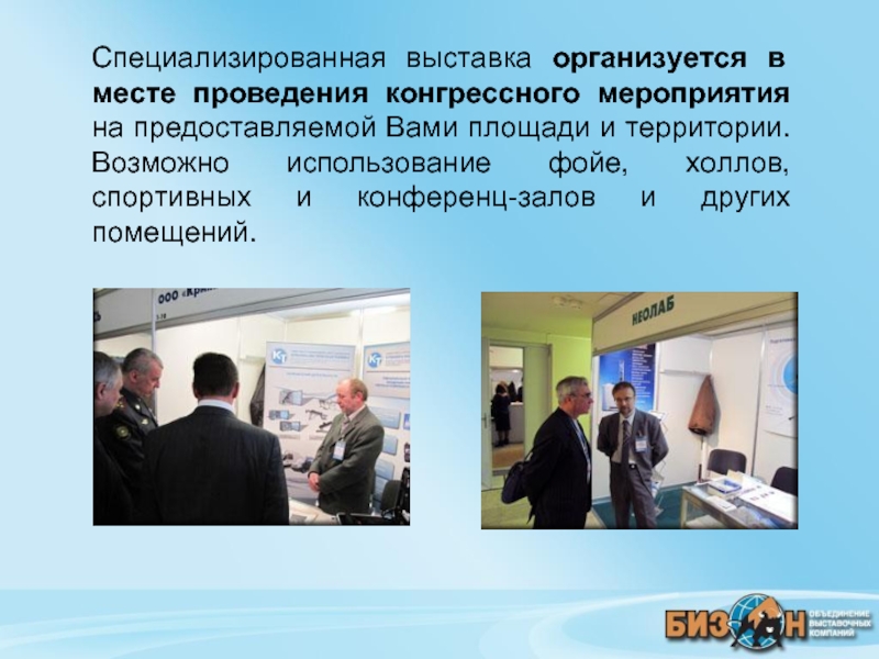Мы организуем и проведем иллюстративное приложение к Вашему конгрессному мероприятию – Специализированную выставку по предложенной Вами тематике!
