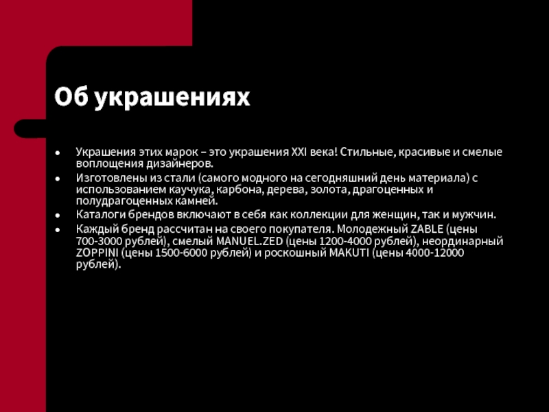 Каждый бренд рассчитан на своего покупателя. Молодежный ZABLE (цены 700-3000 рублей), смелый MANUEL.ZED (цены 1200-4000 рублей), неординарный ZOPPINI (цены 1500-6000 рублей) и роскошный MAKUTI (цены 4000-12000 рублей).