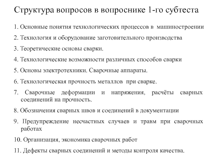 Слайд 4Структура вопросов в вопроснике 1-го субтеста