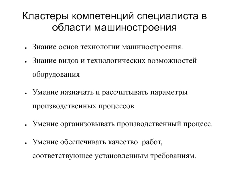 Слайд 2Кластеры компетенций специалиста в области машиностроения