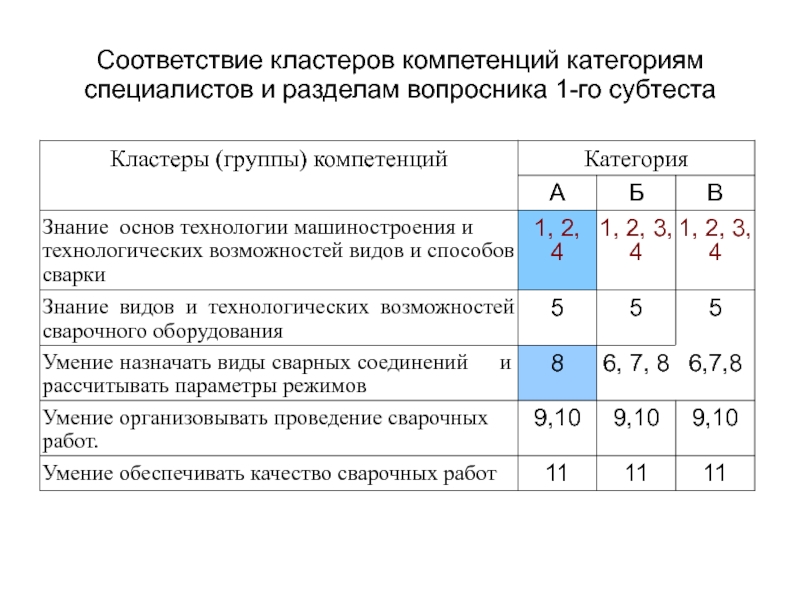 Слайд 5Соответствие кластеров компетенций категориям специалистов и разделам вопросника 1-го субтеста