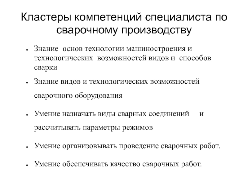 Слайд 3Кластеры компетенций специалиста по сварочному производству