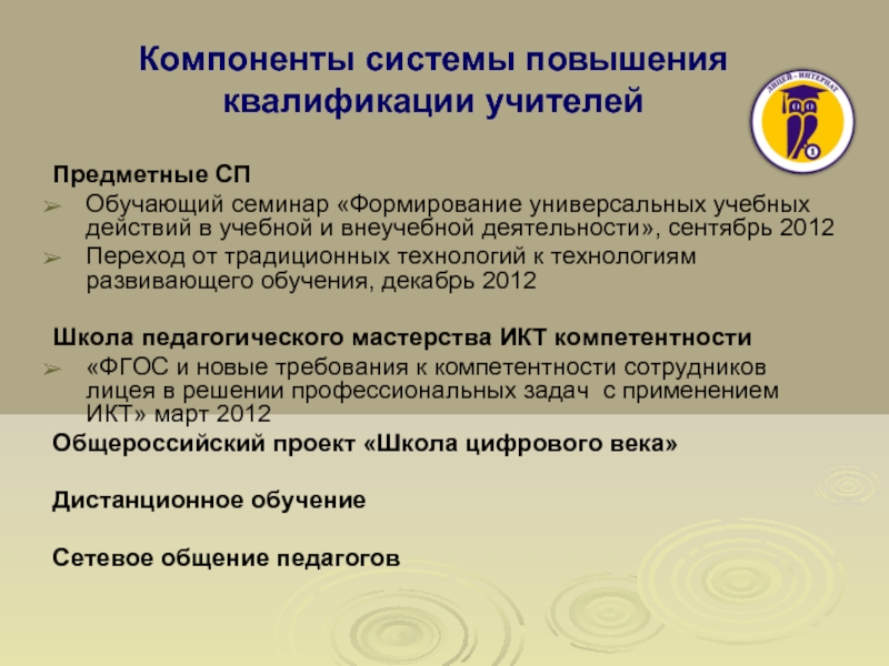 формирование базовых знаний педагогов по переходу на работу по ФГОС, изучение требований к усвоению учебных программ, проектирование универсальных учебных действий - личностных, коммуникативных, регулятивных и познавательных.