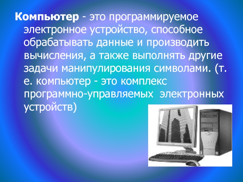 вычисления, а также выполнять другие задачи манипулирования символами. (т.е. компьютер - это комплекс программно-управляемых электронных устройств)