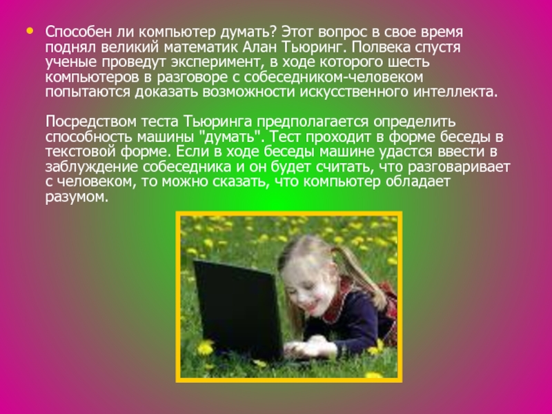 Слайд 8Способен ли компьютер думать? Этот вопрос в свое время поднял великий
