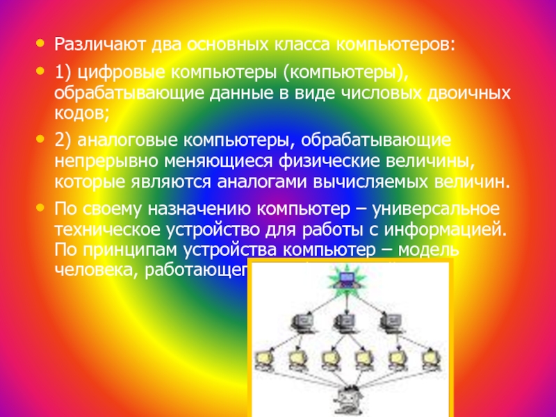 По своему назначению компьютер – универсальное техническое устройство для работы с информацией. По принципам устройства компьютер – модель человека, работающего с информацией.