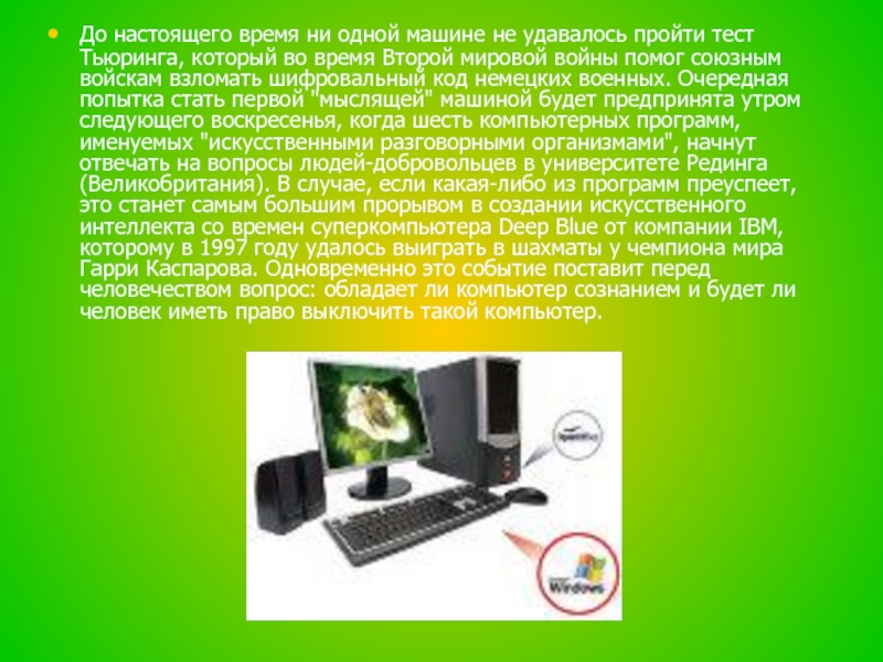 Слайд 9До настоящего время ни одной машине не удавалось пройти тест Тьюринга,