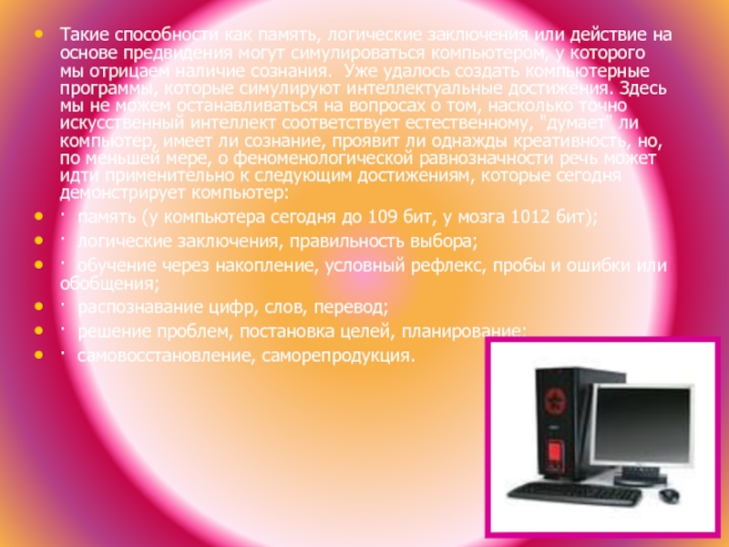 · память (у компьютера сегодня до 109 бит, у мозга 1012 бит);