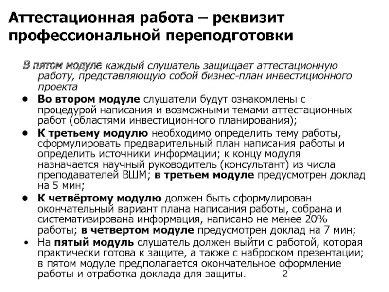 Во втором модуле слушатели будут ознакомлены с процедурой написания и возможными темами аттестационных работ (областями инвестиционного планирования);