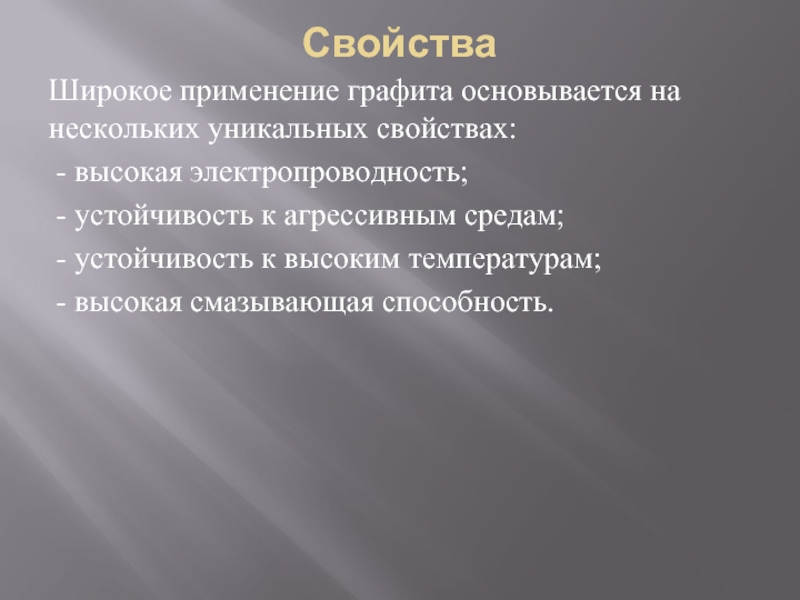 Широкое применение графита основывается на нескольких уникальных свойствах: