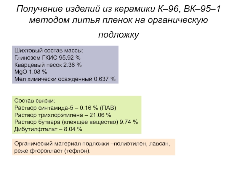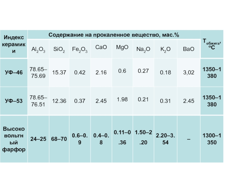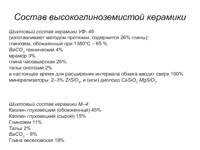 ZrO2, TiO2, Cr2O3, MnO2, Fe2O3, Y2O3, MgO, тальк 0.5–2 % по массе.