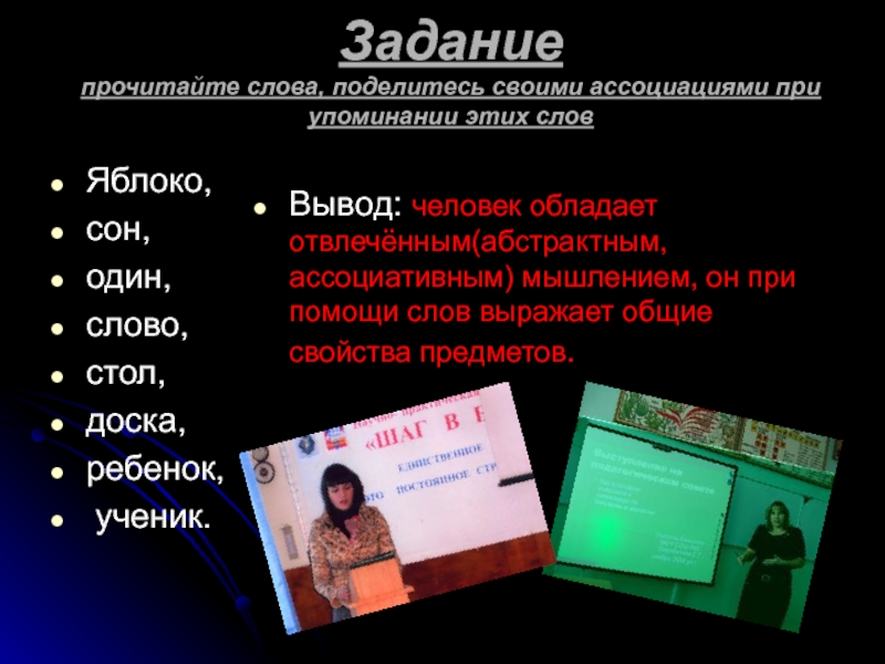 Вывод: человек обладает отвлечённым(абстрактным, ассоциативным) мышлением, он при помощи слов выражает общие свойства предметов.