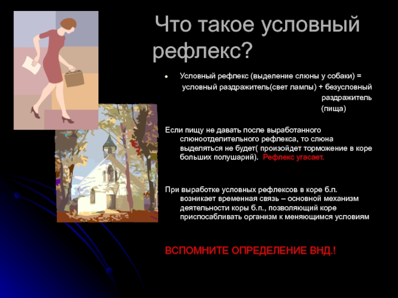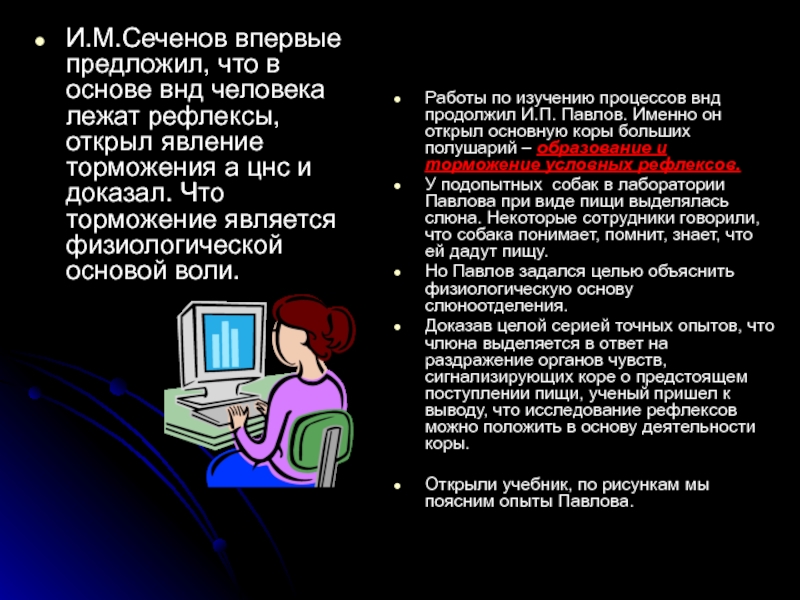 Работы по изучению процессов внд продолжил И.П. Павлов. Именно он открыл основную коры больших полушарий – образование и торможение условных рефлексов.