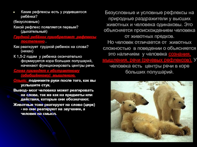 Грудной ребёнок приобретает рефлексы постепенно .