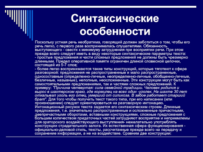 - более легко воспринимаются такие типы конструкций, которые тяготеют к сфере разговорной: предложения не распространенные и мало распространенные, односоставные (определенно-личные, неопределенно-личные, обобщенно-личные, безличные, назывные), неполные, неосложненные. Эти конструкции могут быть как самостоятельными предложениями, так и частями сложных предложений. К примеру: "Причина четвертая: сила семейной традиции. Человек родился и вырос в шахтерском краю, где кормилец на всех один -уголек. На шахте 30 лет откалывал уголь его отец, умерший от силикоза. В забое работает старший брат". Для того чтобы получить текст такого типа, при его написании (или произношении) следует ориентироваться на разговорную интонацию. Интонационный рисунок текста задается его синтаксическим строем. Длинные предложения, т.е. значительно распространенные и осложненные причастными, деепричастными оборотами, вставными конструкциями, сложные предложения с большим количеством придаточных частей затрудняют восприятие и неприемлемы для ораторского воздействующего выступления- нежелательно употреблять конструкции страдательного залога. Их естественная сфера функционирования - официально-деловой стиль, тексты, рассчитанные прежде всего на передачу и сохранение информации, а не на воздействие. Сравним две конструкции: