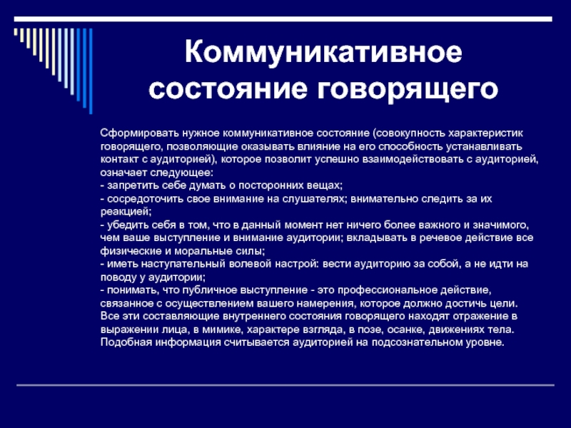 оказывать влияние на его способность устанавливать контакт с аудиторией), которое позволит успешно взаимодействовать с аудиторией, означает следующее: