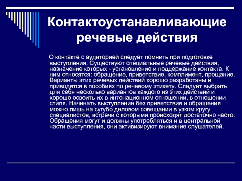 при подготовке выступления. Существуют специальные речевые действия, назначение которых - установление и поддержание контакта. К ним относятся: обращение, приветствие, комплимент, прощание. Варианты этих речевых действий хорошо разработаны и приводятся в пособиях по речевому этикету. Следует выбрать для себя несколько вариантов каждого из этих действий и хорошо освоить их в интонационном отношении, в отношении стиля. Начинать выступление без приветствия и обращения можно лишь на сугубо деловом совещании в узком кругу специалистов, встречи с которыми происходят достаточно часто. Обращения могут и должны употребляться и в центральной части выступления, они активизируют внимание слушателей.