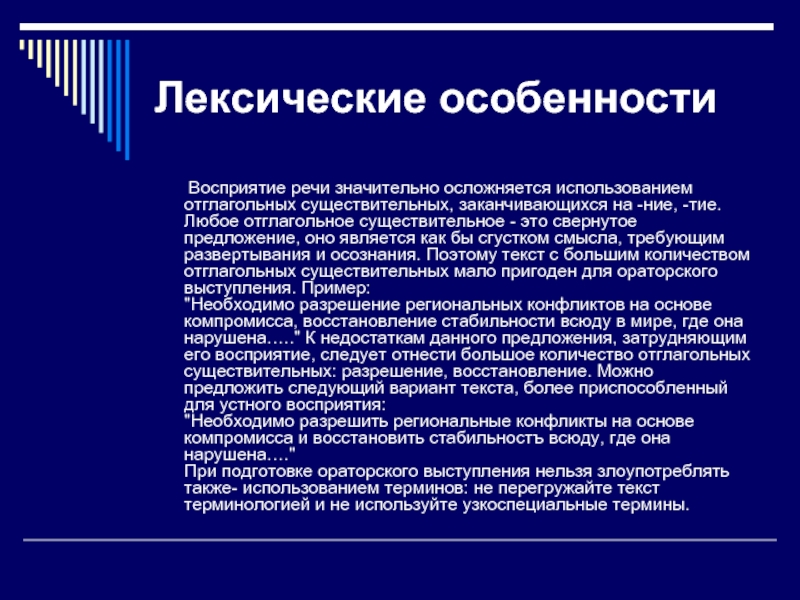 отглагольных существительных, заканчивающихся на -ние, -тие. Любое отглагольное существительное - это свернутое предложение, оно является как бы сгустком смысла, требующим развертывания и осознания. Поэтому текст с большим количеством отглагольных существительных мало пригоден для ораторского выступления. Пример: