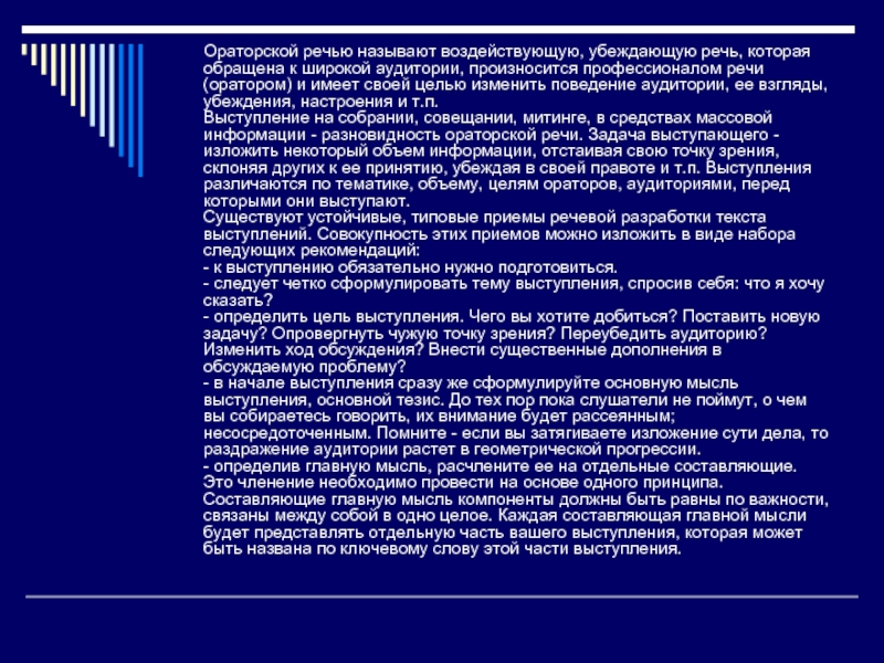 Существуют устойчивые, типовые приемы речевой разработки текста выступлений. Совокупность этих приемов можно изложить в виде набора следующих рекомендаций: