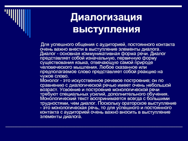 контакта очень важно внести в выступление элементы диалога. Диалог - основная коммуникативная форма речи. Диалог представляет собой изначальную, первичную форму существования языка, отвечающую самой природе человеческого мышления. Любое сказанное или предполагаемое слово представляет собой реакцию на чужое слово.