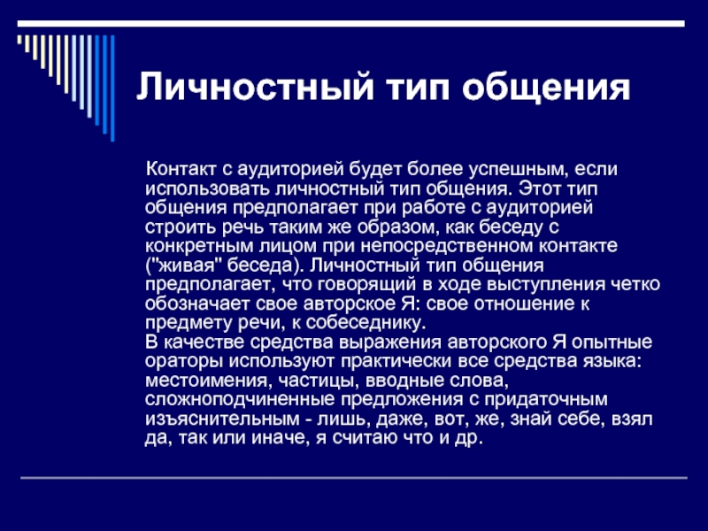 успешным, если использовать личностный тип общения. Этот тип общения предполагает при работе с аудиторией строить речь таким же образом, как беседу с конкретным лицом при непосредственном контакте ("живая" беседа). Личностный тип общения предполагает, что говорящий в ходе выступления четко обозначает свое авторское Я: свое отношение к предмету речи, к собеседнику.
