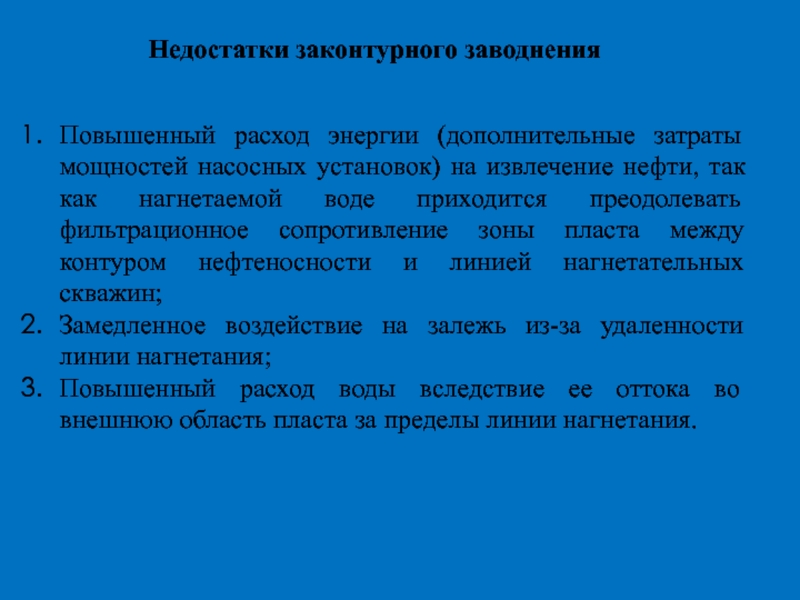 С энергетической точки зрения приконтурное заводнение более экономично, хотя при хорошей гидропроводности внешней области потери нагнетаемой воды неизбежны.