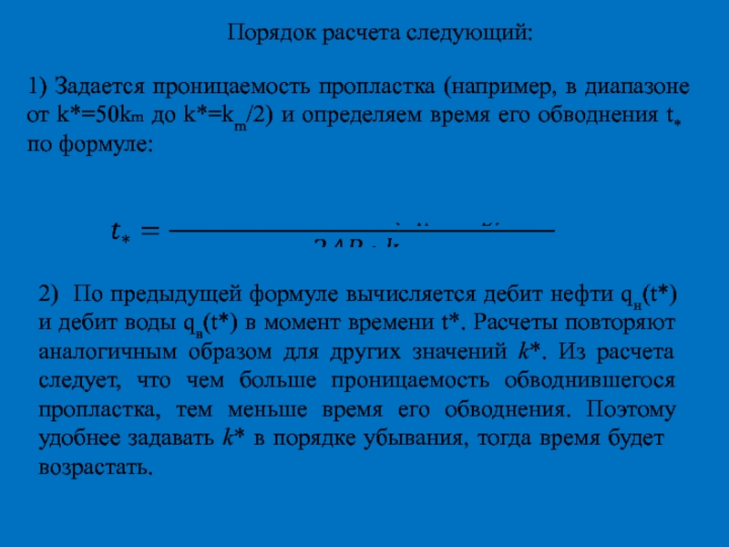 2) По предыдущей формуле вычисляется дебит нефти qн(t*) и дебит воды qв(t*) в момент времени t*. Расчеты повторяют аналогичным образом для других значений k*. Из расчета следует, что чем больше проницаемость обводнившегося пропластка, тем меньше время его обводнения. Поэтому удобнее задавать k* в порядке убывания, тогда время будет возрастать.