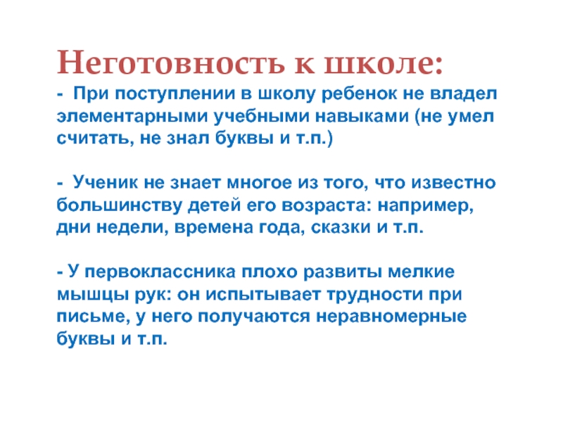 учебными навыками (не умел считать, не знал буквы и т.п.)
