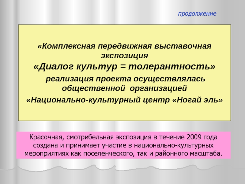 Красочная, смотрибельная экспозиция в течение 2009 года создана и принимает участие в национально-культурных мероприятиях как поселенческого, так и районного масштаба.