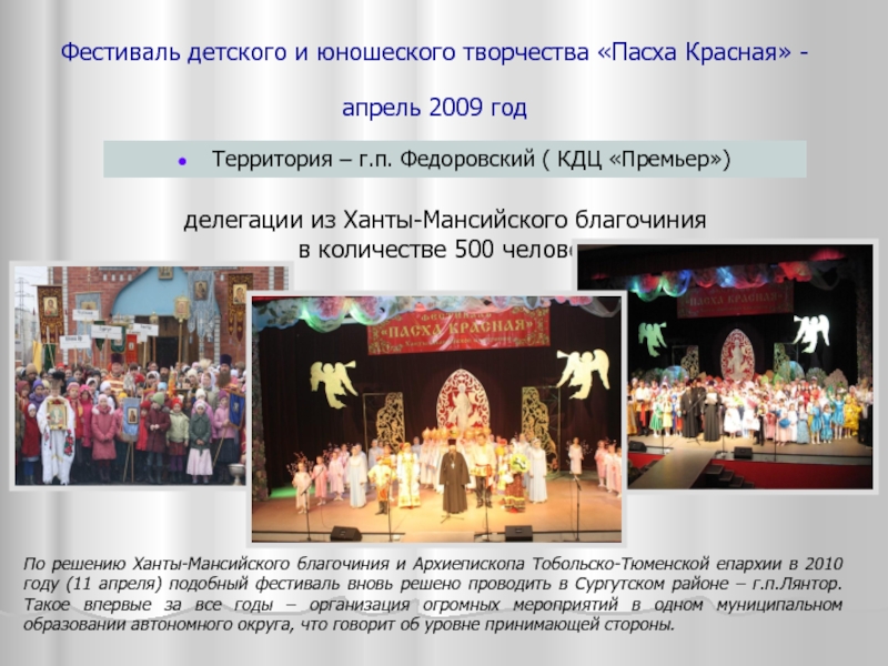 По решению Ханты-Мансийского благочиния и Архиепископа Тобольско-Тюменской епархии в 2010 году (11 апреля) подобный фестиваль вновь решено проводить в Сургутском районе – г.п.Лянтор. Такое впервые за все годы – организация огромных мероприятий в одном муниципальном образовании автономного округа, что говорит об уровне принимающей стороны.