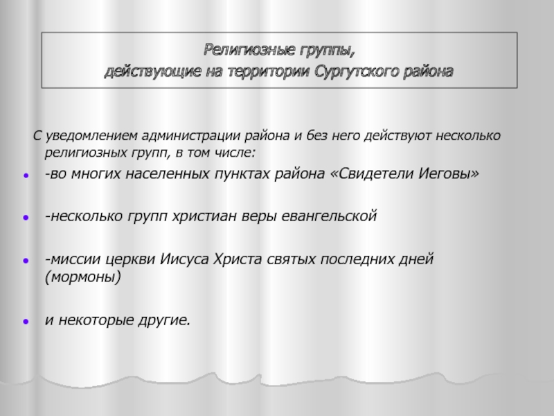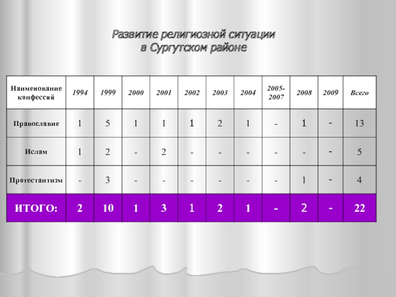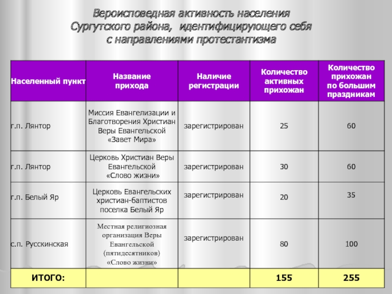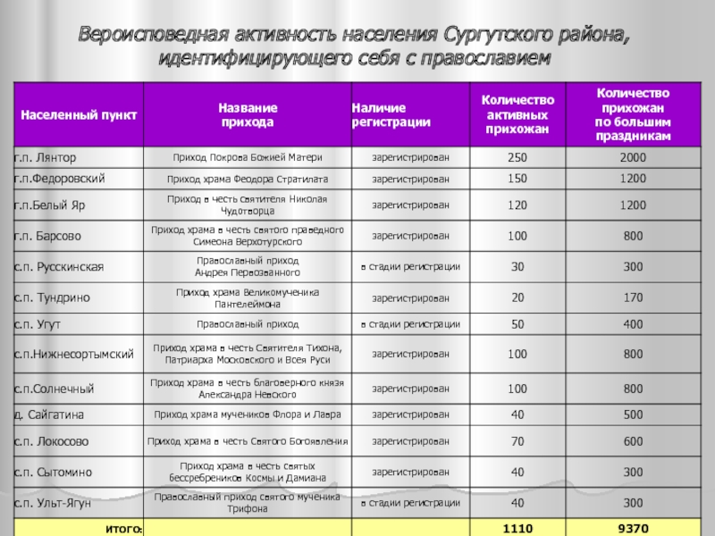 В Сургутском районе, начиная с 1994 года, зарегистрированы и действуют 22 религиозные организации, в том числе: