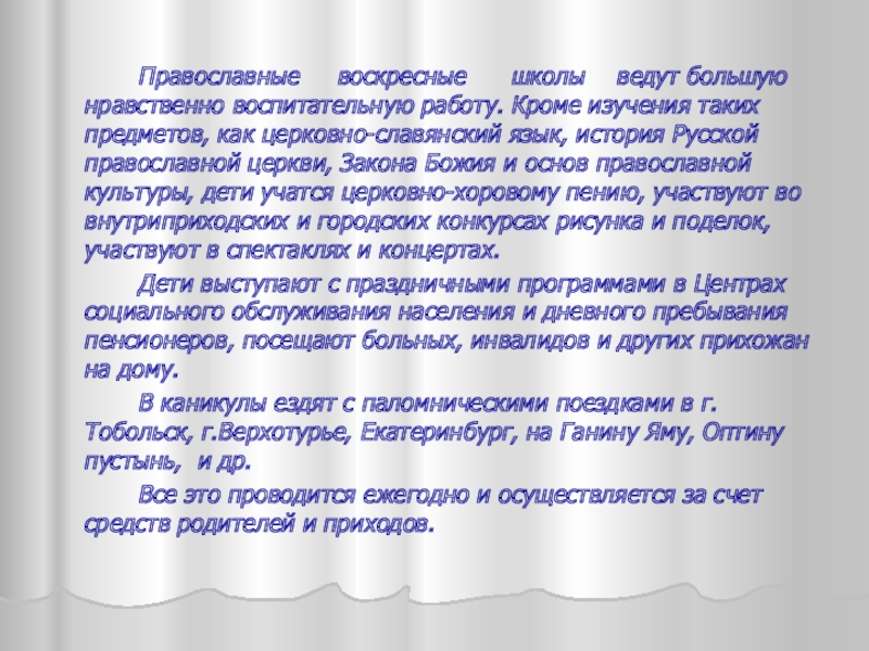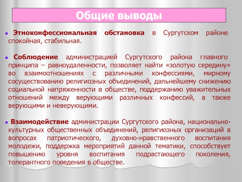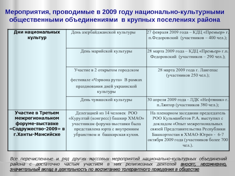 Все перечисленные и ряд других массовых мероприятий национально-культурных объединений района с достаточно частым участием в них религиозных деятелей вносят, несомненно, значительный вклад в деятельность по воспитанию толерантного поведения в обществе