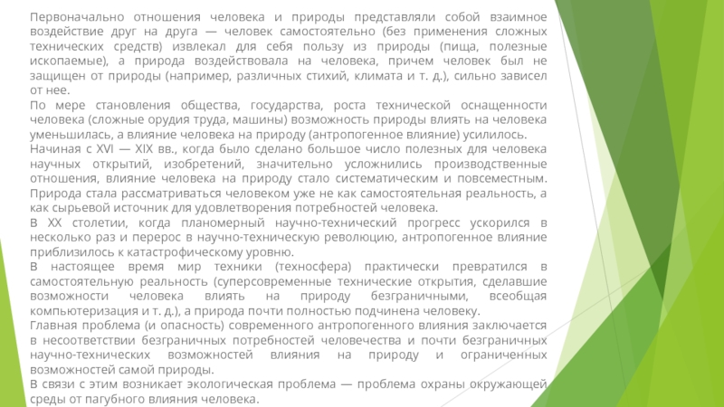друга — человек самостоятельно (без применения сложных технических средств) извлекал для себя пользу из природы (пища, полезные ископаемые), а природа воздействовала на человека, причем человек был не защищен от природы (например, различных стихий, климата и т. д.), сильно зависел от нее.