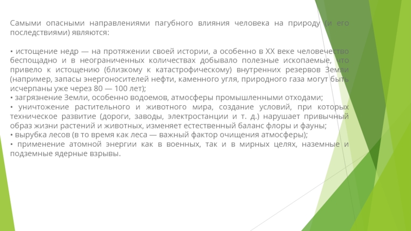 Слайд 11Самыми опасными направлениями пагубного влияния человека на природу (и его последствиями)
