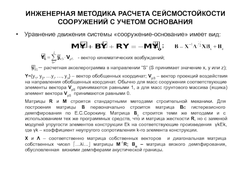 Y={y1, y2, …yi, …, yn} – вектор обобщенных координат; VpS – вектор проекций воздействия на направления обобщенных координат. Обычно для масс сооружения соответствующие элементы вектора VpS принимаются равными 1, а для масс грунтового массива (ящика) элемент вектора VpS принимаются равными 0.