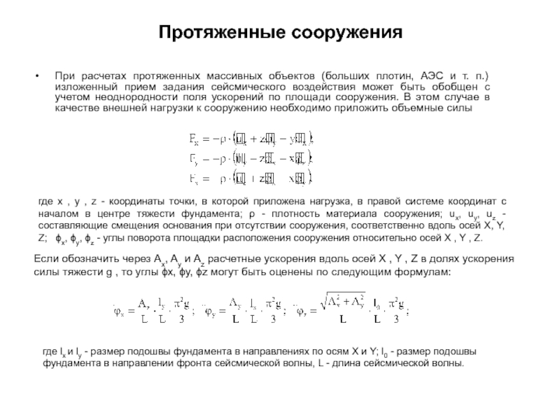 где x , y , z - координаты точки, в которой приложена нагрузка, в правой системе координат с началом в центре тяжести фундамента; ρ - плотность материала сооружения; ux, uy, uz - составляющие смещения основания при отсутствии сооружения, соответственно вдоль осей X, Y, Z; ϕx, ϕy, ϕz - углы поворота площадки расположения сооружения относительно осей X , Y , Z.