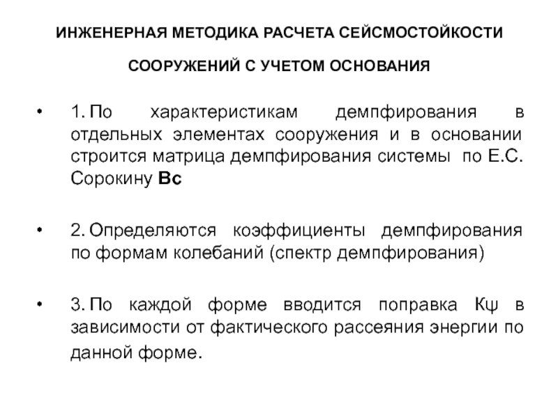 Матрицы R и M строятся стандартными методами строительной механики. Для построения матрицы B первоначально строится матрица Bс гистерезисного демпфирования по Е.С.Сорокину. Матрица Bс строится теми же методами и с использованием тех же программных средств, что и матрица жесткости R, но с заменой модулей упругости элементов конструкции Ek на соответствующие произведения γkEk, где γk – коэффициент неупругого сопротивления k-го элемента конструкции.