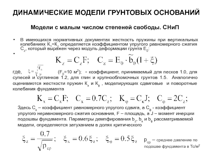 Здесь Сх – коэффициент равномерного упругого сдвига, а Сϕ - коэффициент упругого неравномерного сжатия основания, F – площадь, а J – момент инерции подошвы фундамента. Параметры демпфирования bz, bx и bϕ рассматриваемой модели, определяются затуханием в долях критического