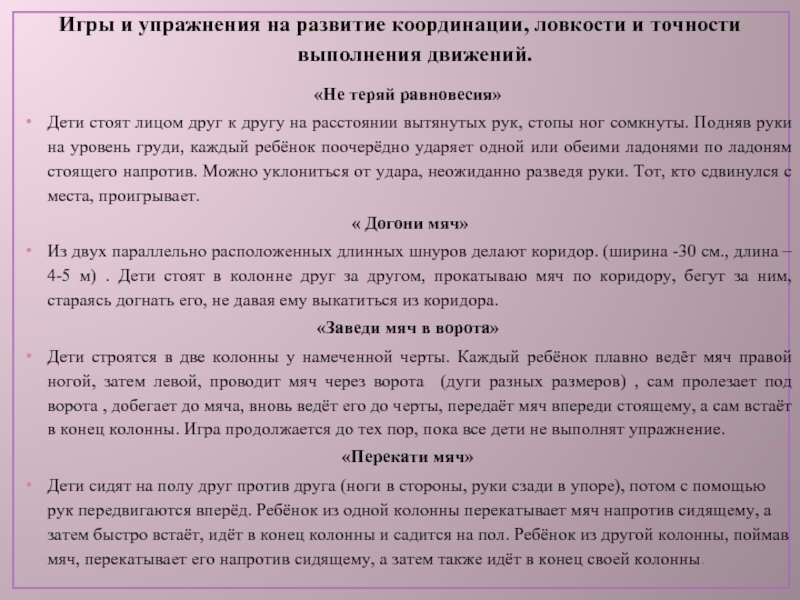 Слайд 28Игры и упражнения на развитие координации, ловкости и точности выполнения движений.