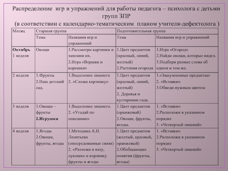 Слайд 4Распределение игр и упражнений для работы педагога – психолога с детьми