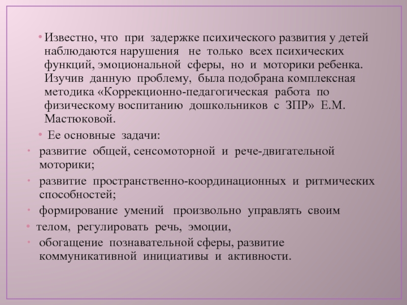 не только всех психических функций, эмоциональной сферы, но и моторики ребенка. Изучив данную проблему, была подобрана комплексная методика «Коррекционно-педагогическая работа по физическому воспитанию дошкольников с ЗПР» Е.М. Мастюковой.