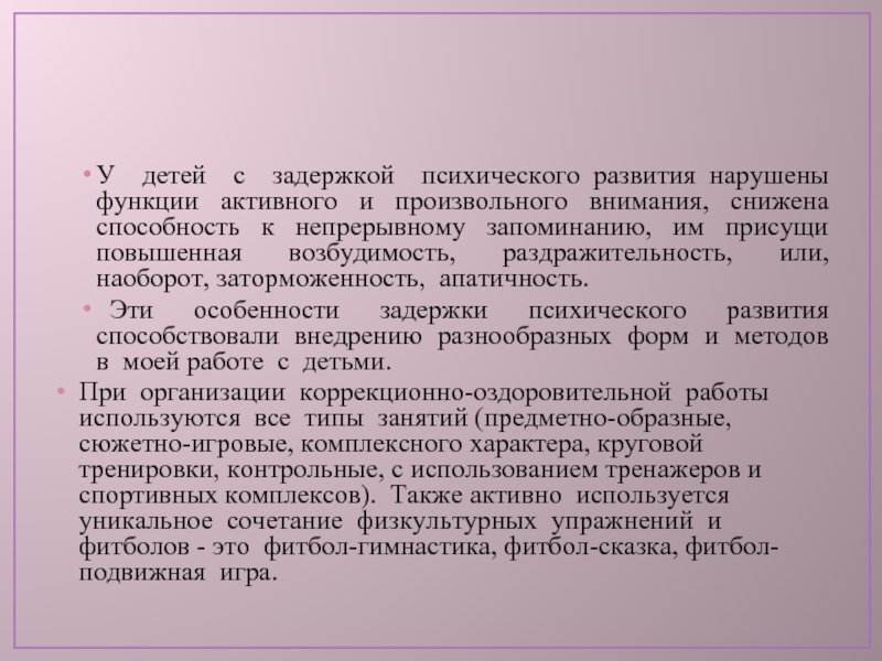 Эти особенности задержки психического развития способствовали внедрению разнообразных форм и методов в моей работе с детьми.