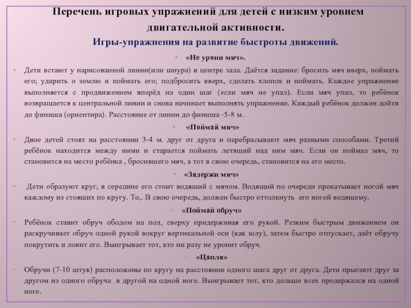 Слайд 26Перечень игровых упражнений для детей с низким уровнем двигательной активности.