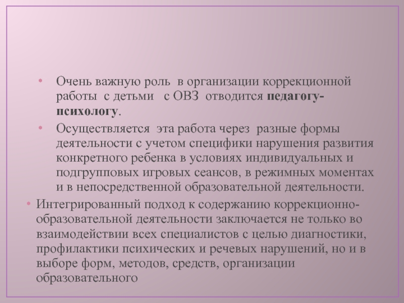 Интегрированный подход к содержанию коррекционно-образовательной деятельности заключается не только во взаимодействии всех специалистов с целью диагностики, профилактики психических и речевых нарушений, но и в выборе форм, методов, средств, организации образовательного