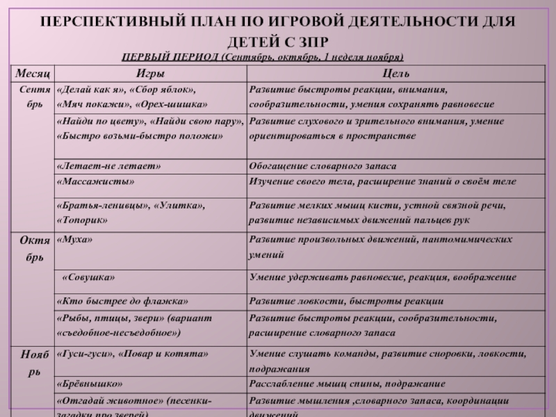 ПЕРСПЕКТИВНЫЙ ПЛАН ПО ИГРОВОЙ ДЕЯТЕЛЬНОСТИ ДЛЯ ДЕТЕЙ С ЗПР